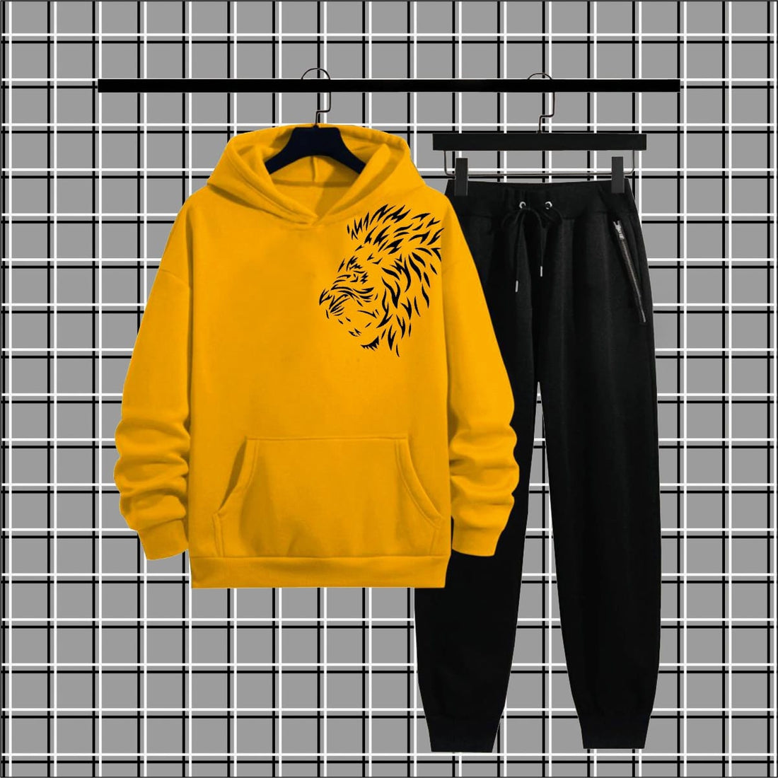 *yellow hoodie* with a *black lion graphic* on the front, paired with *black joggers*. The...
