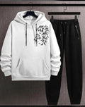 This sick combo of a white hoodie with a bold black lion graphic and black joggers is perfect for those who wanna rock a comfy yet stylish look! 💥 The hoodie features a hood, drawstrings, and a front pocket – ideal for chillin' or gettin' active. Paired with sleek black joggers that got drawstrings too, this outfit's gonna make you look 🔥 fire!